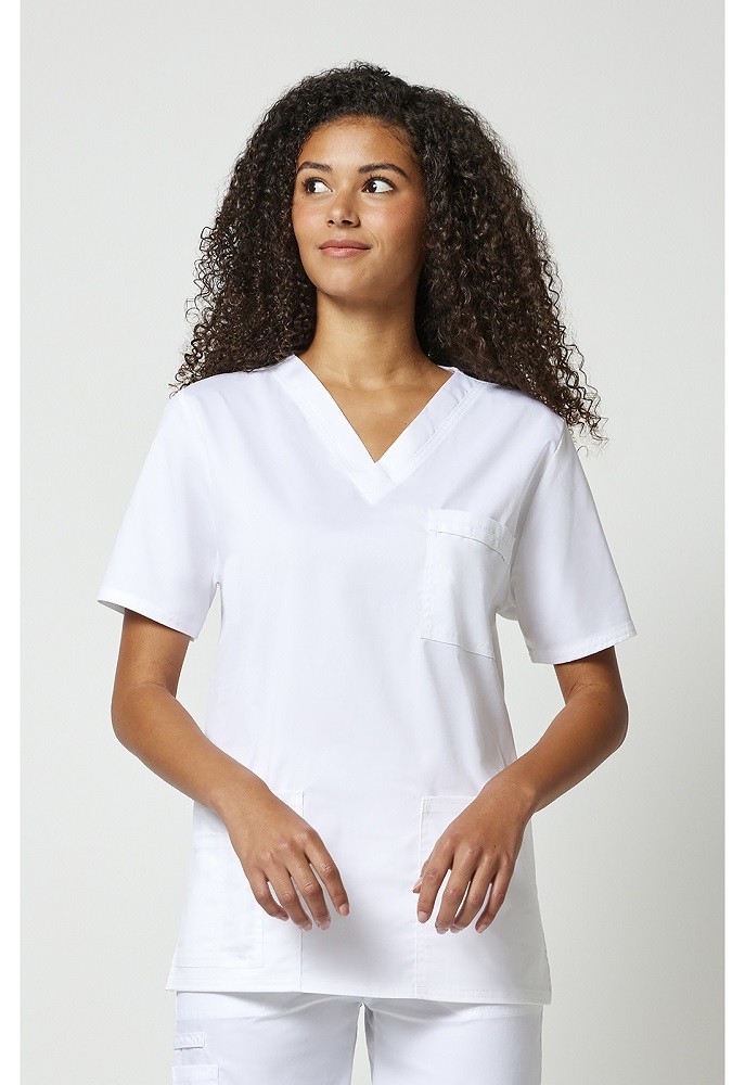 zdravotnícka halena pánska dámska, stretchový materiál 55% bavlna 42% brúsené mikrovlákno 3% elastan, výstrih do V, bočné rázporky, dve predné vrecká, jedná náprsné vrecko, pranie pri nízkych teplotách, sušenie pri nízkych teplotách, farba biela Viac o produkte
