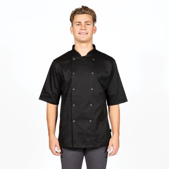 kucharsky rondon vhodný aj pre cukrárov alebo pekárov, lacná, ale kvalitný variant pre učňov, zmes polyesteru a bavlny, krátky rukáv, farba čierna, Viac o produkte