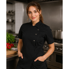 kucharsky rondon dámsky Greta, krátky rukáv, strich SlimFit, skryté zapínanie na gombíky s patentkami, 3 viditeľné patentky, materiál 100% polyester s grafenovou úpravou, 110 g/m2, antibakteriálne, priedušný, dve bočné vrecká, vetracie otvory 60 stupňov, nesušiť v sušičke, možné chemické čistenie, farba fialová Viac o produkte