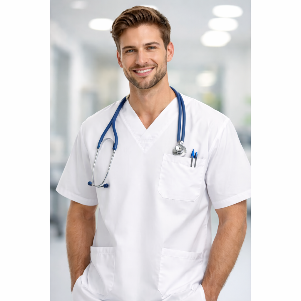 zdravotnícka tunika alebo tiež zdravotnicka kosela damska aj pánska, biela, 35% bavlna a 65% polyester, 3 vrecká, prať do 90st.C, krátky rukáv, výstrih do V, váha 170g / m2, Viac o produkte