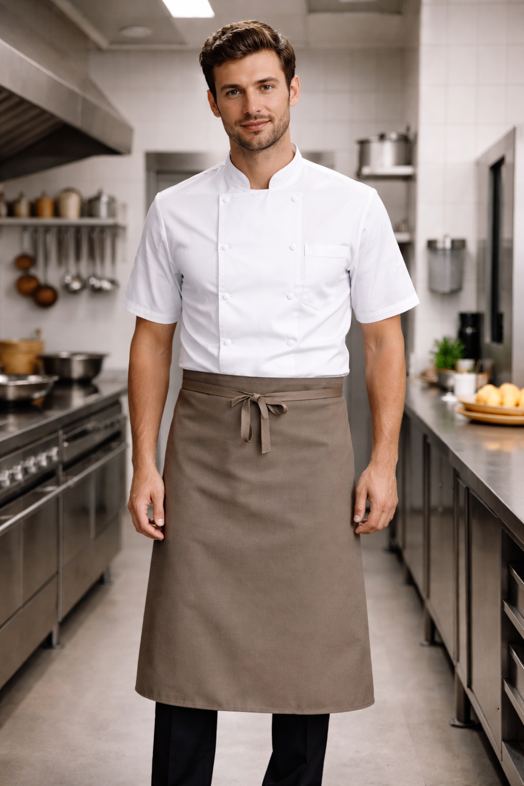 kuchárska zástera alebo tiež casnicka zastera, vhodná aj pro pekárov, cukrárov, barmanov, dĺžka do pásu rozmery 70cmx60cm, 37 farieb, 100% Polyester 200g / m2, prať do 65st.C, farba svetlo hnedá, Viac o produkte