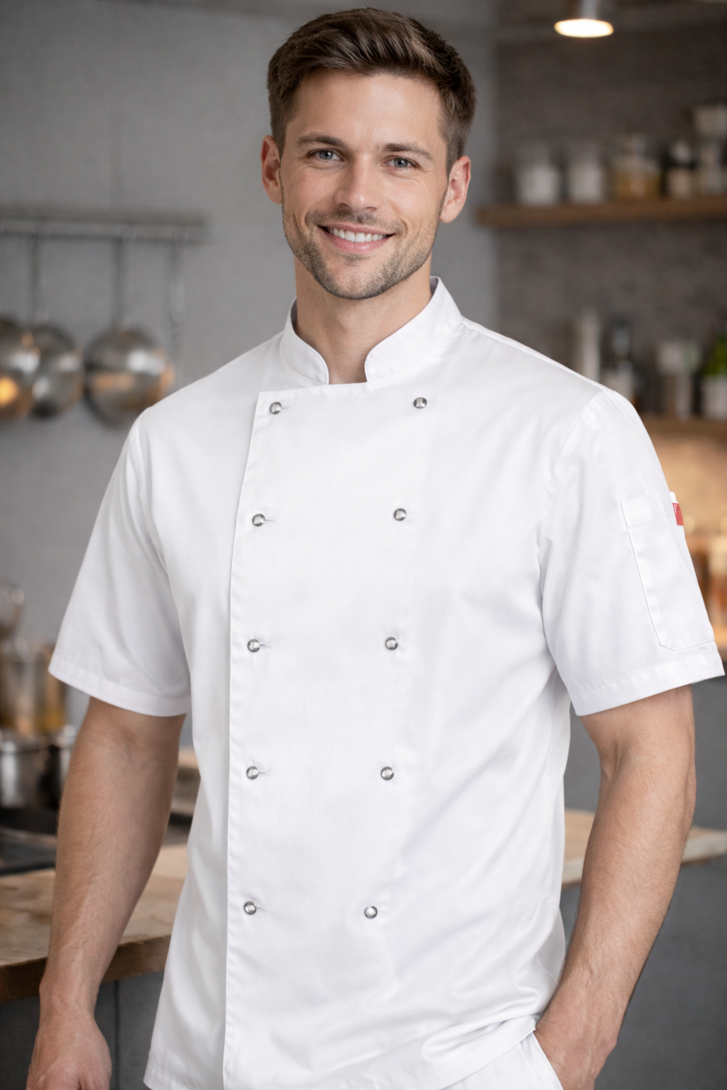 kuchársky rondon biely, 65% polyester a 35% bavlna, dvojradové predné zapínanie na cvoky, krátky rukáv, bez bočného švu, 1 vrecko na paži, váha 175 g / m2, Viac o produkte